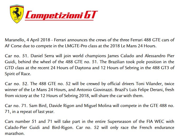 Official: Antonio Giovinazzi will take part in the 24 Hours of Le Mans this year. He will join Toni Vilander and Luis Felipe Derani in the #52 Ferrari 488 GTE #Ferrari