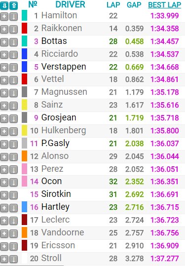 Hamilton kiidätti Mercedeksensä aikaan 1.33,099, ollen 0,359 sekuntia Ferrarin Kimi Räikköstä nopeampi. Valtteri Bottas oli kolmas, 0,468 sekuntia tallikaverinsa perässä. Kauden molemmat aiemmat osakilpailut voittanut Sebastian Vettel oli tulosluettelossa kuudes.