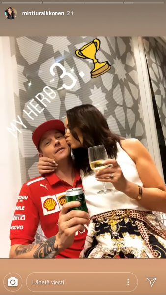 Kimi Räikkönen ei jäänyt murehtimaan lyhyeksi jäänyttä päätöskisaansa Ferrarin ratissa. Vaimo Minttu Räikkönen jakoi Instagramissa kuvan kaksikosta ottamassa rennosti Abu Dhabissa kisan ollessa vielä käynnissä.