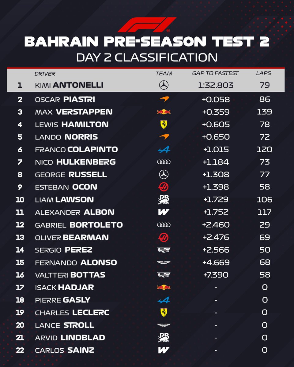 Vaikka kierrosaikoja ei talvitesteissä liikaa tujotella, on nuoren italialaisen noteeraus kuitenkin jatkumoa Mercedeksen vahvalle suorittamiselle talvitestien aikana. Antonelli lasketteli kärkiajan iltapäiväsession loppupuoliskolla peitoten Oscar Piastrin McLarenin noin kuudella sadasosalla. Kolmen kärjen täytti koko päivän Red Bullin puikoissa urakoinut Max Verstappen. Nelinkertainen mestari jäi kärkiajasta kolme ja puoli kymmenystä.