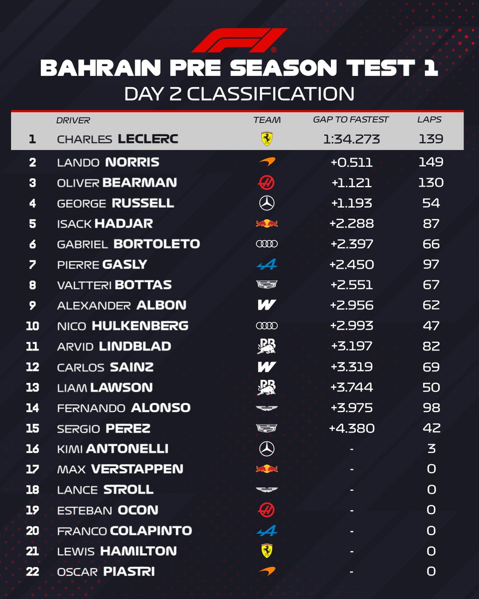 Tuloslistan kärkeen jäi Charles Leclercin aamupäivällä ajettu aika. Ferrari-tähti oli hieman yli puoli sekuntia nopeampi kuin toiseksi ripeimmin Sakhirin radan kiertänyt Norris. Kolmen kärjen täytti Haasin Oliver Bearman ja aikaerot olivat jälleen sen verran valtavia, ettei niitä kannata vieläkään liikaa tuijotella.